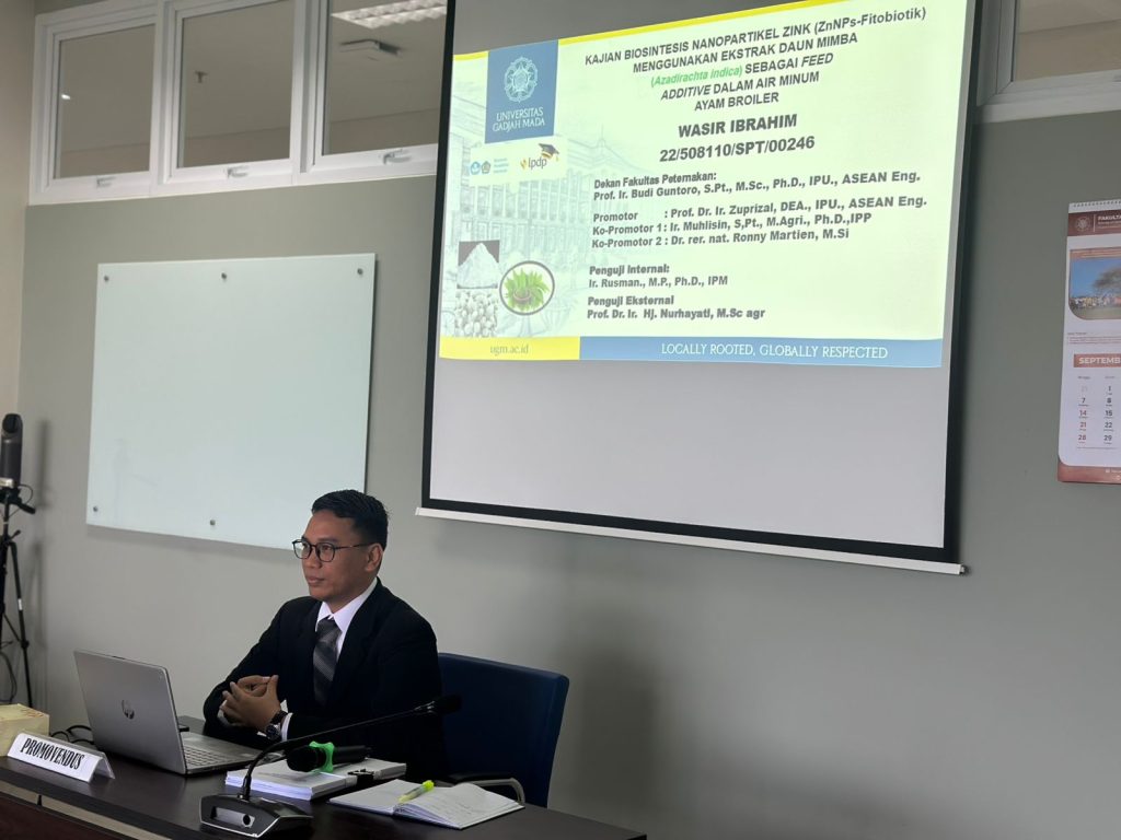 Wasir Ibrahim, mahasiswa Program Studi Doktor Ilmu Peternakan Fakultas Peternakan Universitas Gadjah Mada, berhasil mempertahankan disertasi berjudul “Kajian Biosintesis Nanopartikel Zink Menggunakan Ekstrak Daun Mimba sebagai Feed Additive dalam Air Minum Ayam Broiler”. Penelitian ini dilakukan sebagai upaya mencari alternatif pengganti antibiotic growth promoter (AGP) yang penggunaannya telah dilarang di Indonesia melalui UU No. 41 Tahun 2014. Dengan metode green synthesis, Ibrahim memanfaatkan zink sebagai prekusor dan ekstrak daun mimba (Azadirachta indica) sebagai bioreduktor untuk menghasilkan nanopartikel zink (ZnNPs-Fitobiotik) yang stabil, ramah lingkungan serta berpotensi meningkatkan kesehatan dan produktivitas ayam broiler.